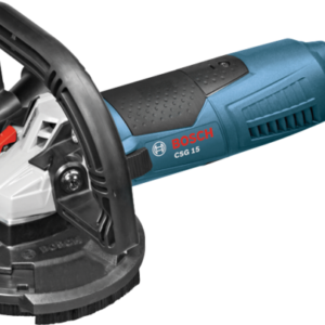 5 In. Concrete Surfacing GrinderThe Bosch CSG15 5- In. Concrete Surfacing Grinder has a dedicated dust-collection shroud for a cleaner work environment, as well as plenty of power. It delivers 12.5 AMPs and up to 9,300 RPM, for concrete grading, surface preparation and other tough concrete applications. Its dedicated dust guard system is a comprehensive solution for collecting dust that allows grinding flush against walls. The system helps to provide a longer operational life, including a sealed motor and a sealed switch. It also has double-sealed ball bearings and two lip-sealing rings to protect against dust contamination. With Constant Response circuitry, this grinder’s motor can handle extended operational load, which allows the user to reach areas where walk-behind unit can’t touch. Its spindle lock allows for quick wheel changes, it has a wrap-around auxiliary handle and it includes Service Minderbrushes.