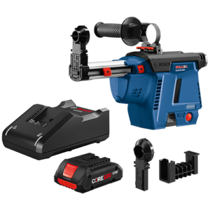 18V Vacuum CleanersThis 18V mobile dust extractor combined with a CORE18V Compact Battery allows users of the Bosch 18V D-handle Bulldog™ to control dust during drilling applications at the jobsite to achieve maximum mobility plus runtime. The GDE18V-26D Mobile Dust extractor provides a true cordless solution when used with the 18V 1 In. GBH18V-26D Bulldog™ rotary hammer. It features a HEPA filter, helping users move toward compliance with OSHA silica dust regulations. It is also compatible with the corded 11255VSR, GBH2-28L and RH228VC Bulldog™ rotary hammers. The attachment comes with two Dust-Eye options (one small, one large) and a 4 In. extension. The dust canister capacity can accommodate up to 20 holes using a 1/2 In. diameter bit, drilling 2 In. deep into concrete. The kit features a CORE18V 4.0 Ah Compact Battery, which have next-gen Li-ion 21700 cell technology for optimal performance in a lightweight, high-power battery. Each GBA18V40 single-layer battery matches the power from the original two-layer 4.0 Ah battery with improved performance per cell.