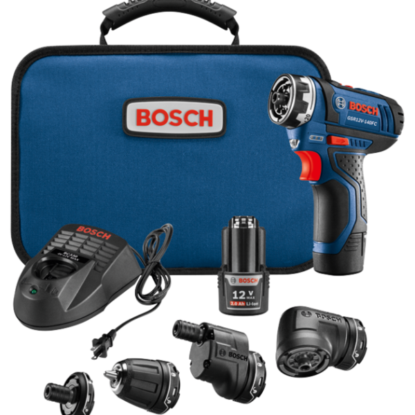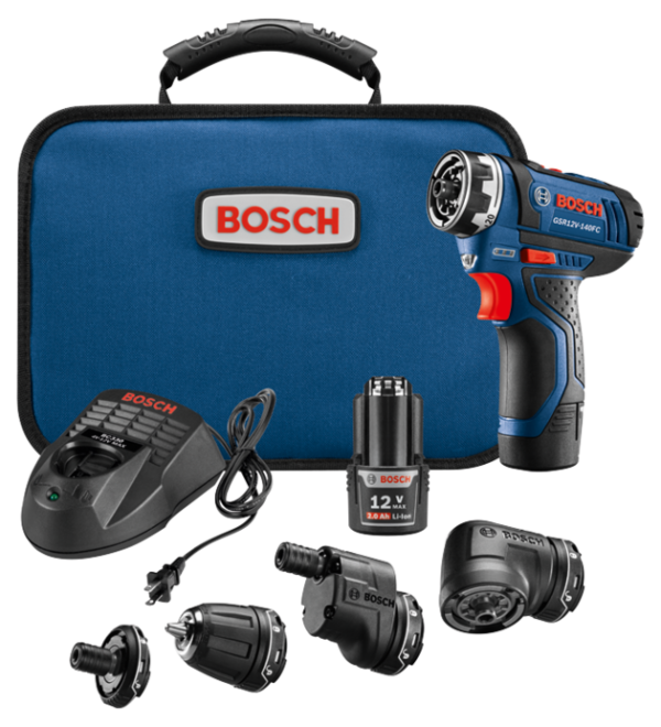 The Bosch 12V Max Flexiclick® 5-In-1 Drill/Driver System is designed for professionals who want a high-quality tool that redefines their limits to get the tough jobs done. At only 1.4 Lbs. and 265 In.-Lbs. of torque, this robust drill/driver delivers the performance you expect in the size you want. It has two speed settings, for quick jobs and precision work. It starts with a magnetic bit holder for basic driving. The four attachments – a locking bit holder, a keyless chuck, an offset angle and a right angle – each attach to the tool securely and easily with the One-Click interface. The right angle attachment is for tight spaces, and it works with all three other adapters. The offset angle attachment delivers precise screwdriving close to edges. Both of these attachments rotate to 16 positions without removing them. The locking bit holder attachment locks hex bits for high-torque drilling, while the keyless chuck provides locked In. drilling.