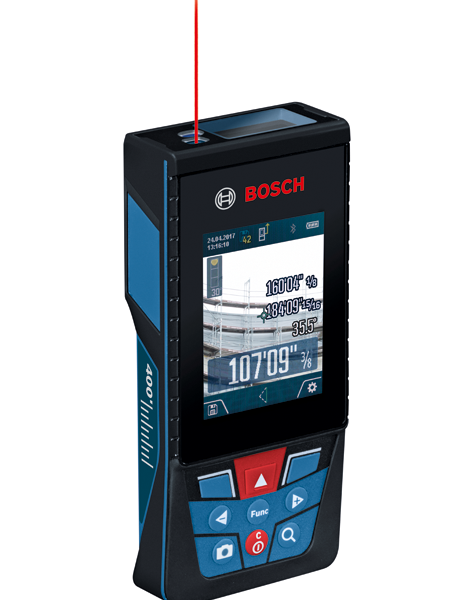 The Bosch BLAZE™ Outdoor GLM400CL Connected Laser Measure with Camera features an adjustable zoom camera to find the laser spot in bright conditions, measuring up to 400 Ft. Transfer the measurement documentation to a smartphone or tablet with Bluetooth® using Bosch’s MeasureOn app. Note: Photo files are too large to transfer. The outdoor laser measuring device provides default real-time length, length, area, volume and indirect measuring functions – which are simple to take advantage of thanks to the display guide walking through each measurement process. A built-in inclinometer determines the angle of pitch and confirms when the tool is level. The laser measure also features an easy-to-read backlit color display, reinforced screen glass, an easy-to-use display guide and 11 measuring functions (including default real-time measuring). It allows users to see the last 50 measurements on the tool and stores over to 600 images.