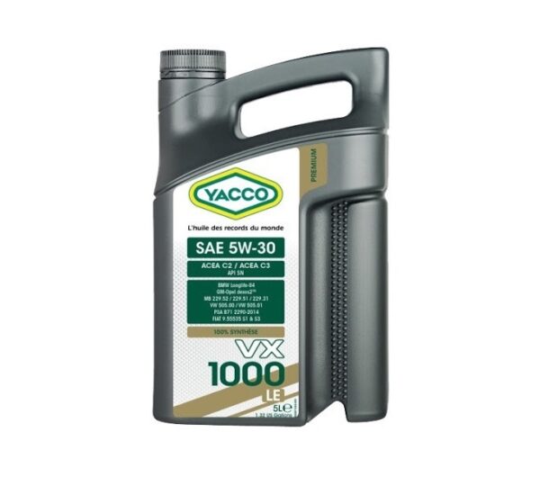Yacco VX 1000 LE SAE 5W30 is a 100 % synthetic oil for gasoline and diesel engines. “Mid SAPS” technology.